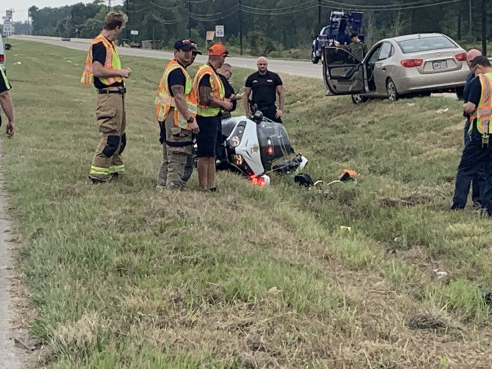 At 1:30 pm on Monday 10/7/19 a Harris County Precinct 1 Deputy Constable and another officer were working an escort of some large vessels from Willis to LaPorte. They were southbound on the US 59 feeder just south of Roman Forest Drive. The officer was at the bottom of the exit ramp flagging motorists to stop when the driver of a Hyundai exited the freeway and slammed into the back of the motorcycle. The officer was transported to Kingwood Hospital in stable condition with non-life threatening injuries. The motorist was not injured.