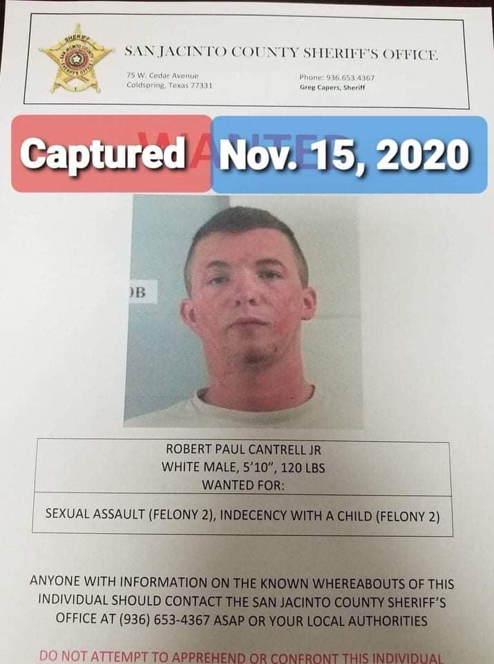 On Sunday, November 15th at about 1900hrs Deputies of the San Jacinto County Sheriff's Office and Montgomery County Constable's Office Precinct 4 apprehended a wanted person, Robert Cantrell Jr., on outstanding felony warrants at the Academy parking lot located at 21770 Market Place, New Caney, TX. This joint effort was the result of several days of surveillance and hard work. This operation was orchestrated by Lead Deputy Bowen who by his dedication and concern for community safety, worked many hours collecting intelligence information on the wanted man. Lieutenant Dougherty, Sergeant Montalvo, Deputies, Pellegrino, and Deweese of San Jacinto County Sheriff's Office, assisted Deputy Bowen in the pursuit and apprehension of this dangerous suspect. Deputy Constable Zack-Beaty and Sergeant Billinger of Montgomery County Constable Precinct 4 were all present to effect the arrest. Prior information revealed the subject Cantrell would be combative and resist arrest, which he did. When Cantrell was approached he was told he was under arrest and immediately began an extended fist fight with Deputies in the Academy parking lot. Two Deputies were injured, Cantrell was treated at the scene by EMS and then taken to the San Jacinto County Jail to be booked in. He was charged with an outstanding Pardon and Parole warrant for Burglary of a Habitation, Sexual Assault and Indecency with a Child warrant, and was discovered to be in possession of one ounce of marijuana secreted on his person at the jail. He was then charged with Possession of a Prohibited Substance in a Correctional Facility. A grand total of three felonies and one misdemeanor.