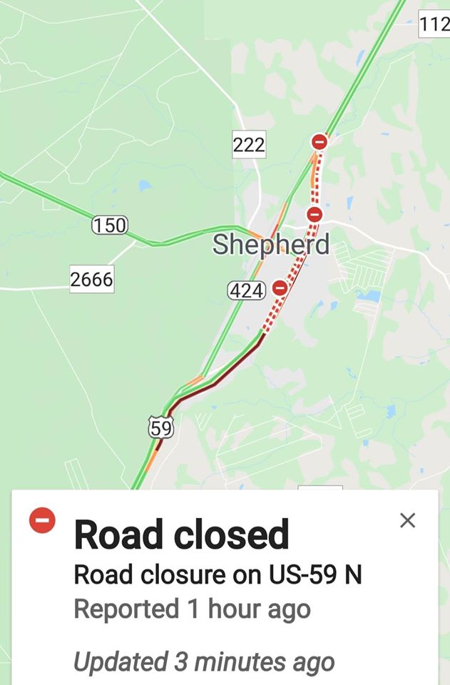 2-25-20@9:40 am Traffic Alert Shepherd Major MVA/Fatality 18-wheeler Hwy. 59 CLOSED near the Executive Inn All Southbound traffic is being rerouted to loop 424. Avoid the area if possible.